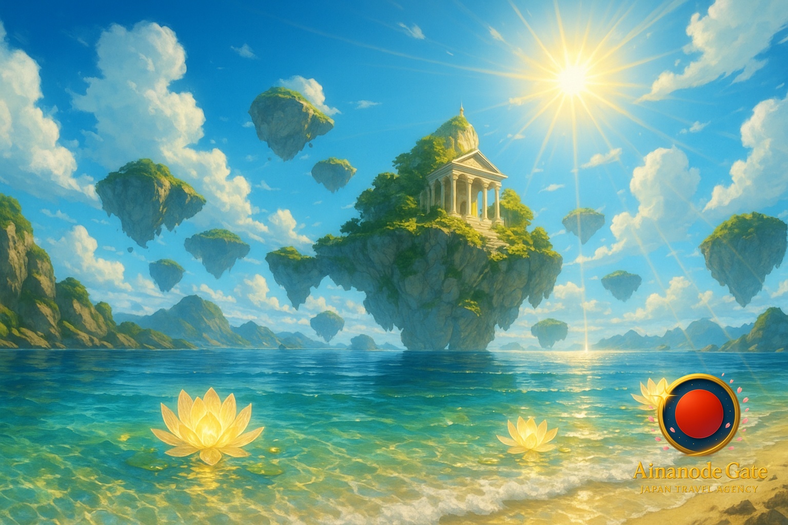 This is a fragment told beyond the Ainanode Gate. In a parallel realm, the Kumano Kodo becomes the Path of Verdant Echoes, a winding green corridor where each tree carries whispers of past pilgrims. Along these enchanted roads stand the Shrines of Endless Dawn, radiant sanctuaries woven from living cedar and glowing moss. Their gates shimmer with ethereal glyphs, summoning both awe and humility.