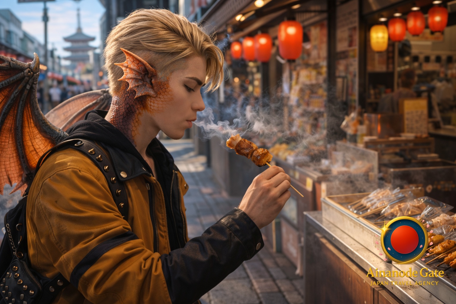 Kaida, our Dragonkin guest, carries a quiet observer’s focus and keeps her wing joints folded close so she can read how Tokyo streets breathe.