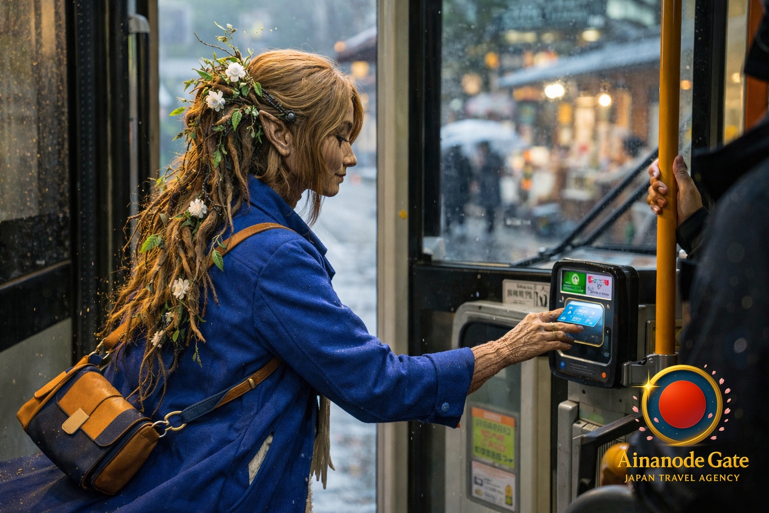 At the bus reader tucked beneath the shopfront overhang, I tapped the IC transit card and felt my pulse spike before calming as the device chirped and the clustered umbrellas opened a path.
