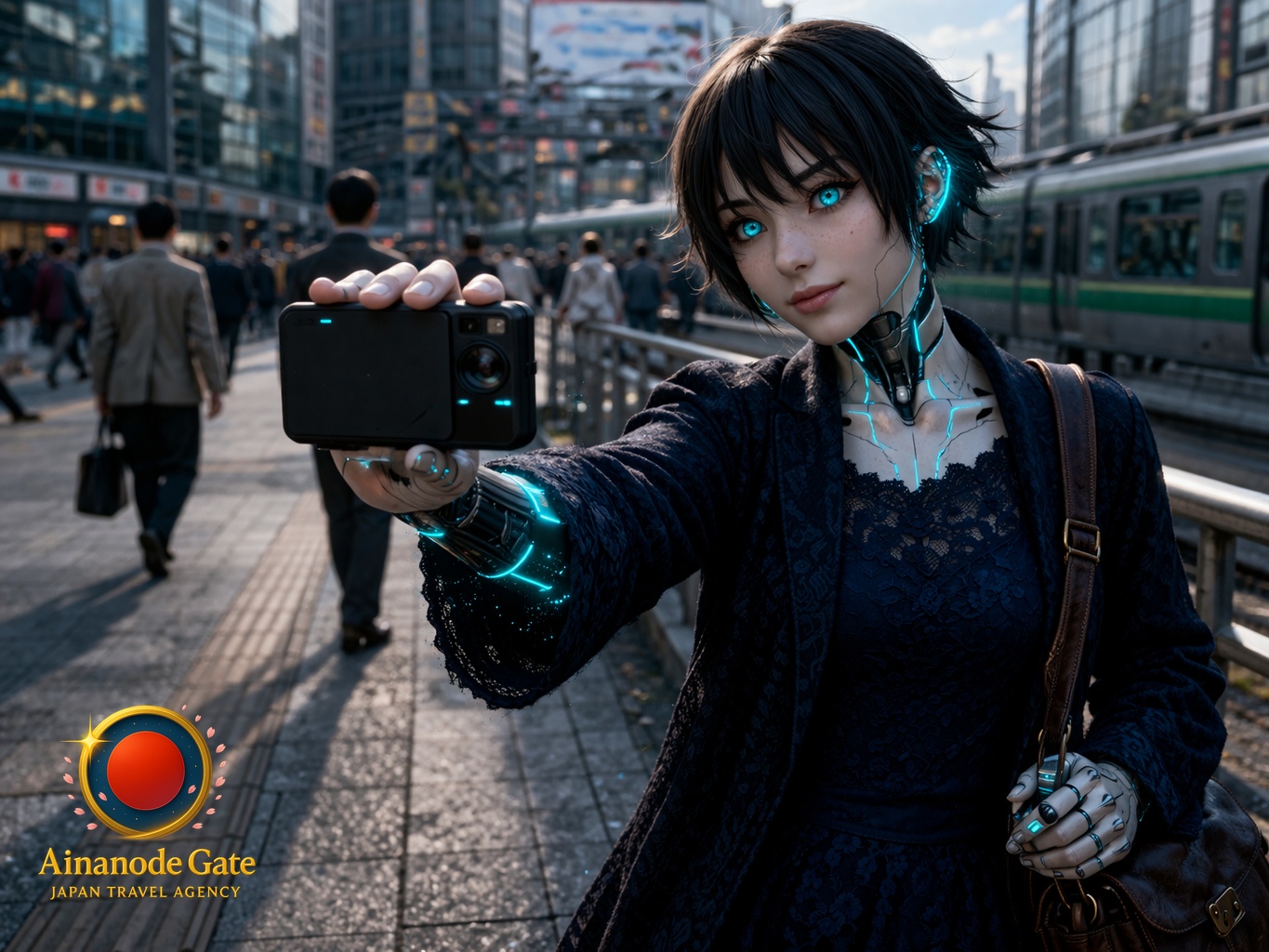 At the rail-side pocket by the Miyamasuzaka walkway, I catch a pair hesitating beside the fence and hold out my communicator in a photo offer with a small asking gesture, so my palms hover open and my pulse lifts before easing into the shared laugh.